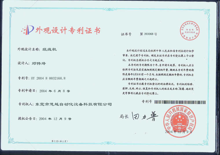我司于2004年獲得繞線機技外觀設計專利證書: